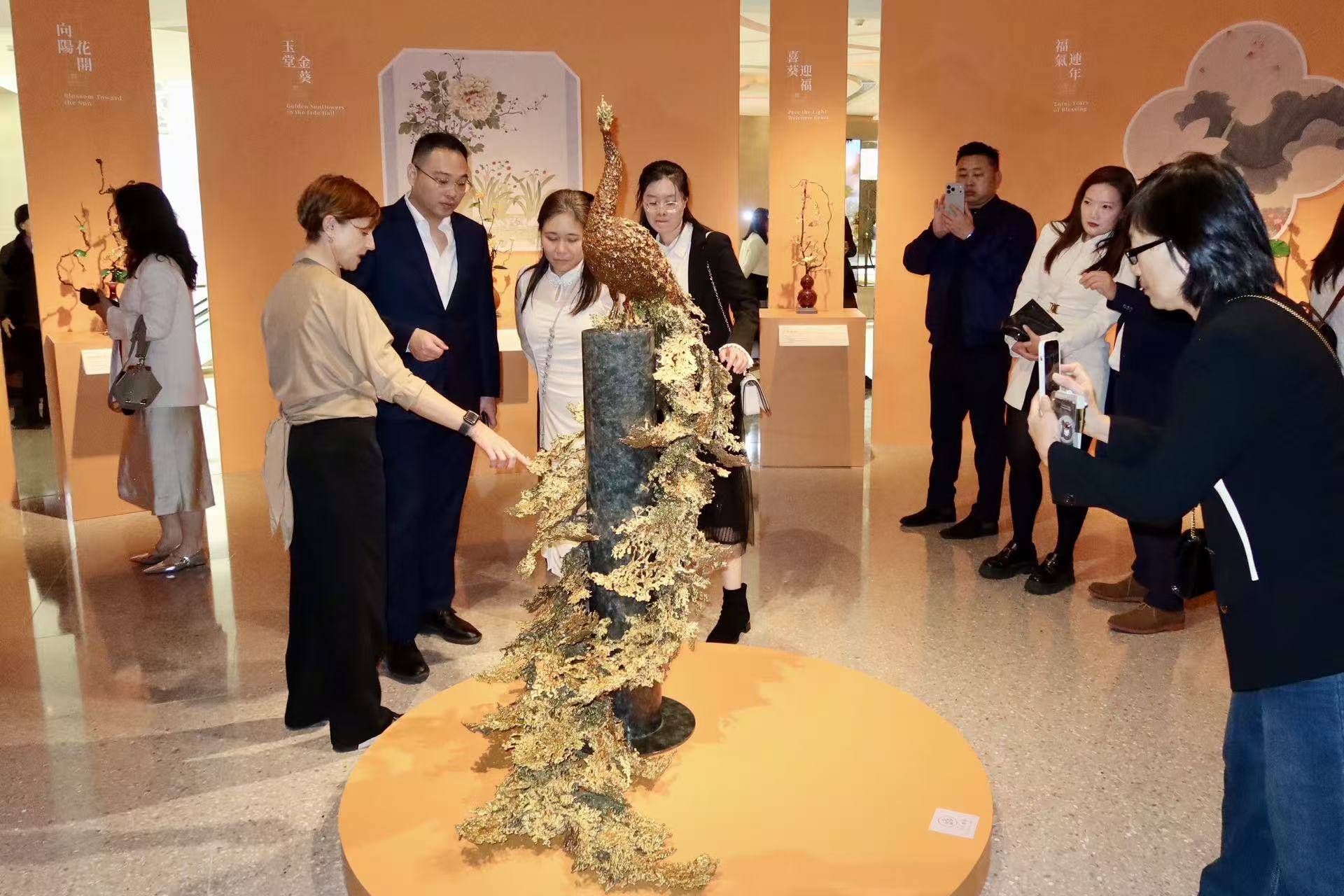 朱炳仁分享,去年初他於中國國家博物館舉辦展覽,首次推出極具開創性的文化藝術成果「熔銅藝術」,突破了青銅文化依賴模具成型的傳統框架,邁出了關鍵一步:讓銅在高溫熔融中自由流淌,不再依賴模具,將藝術家的思想與精神注入金屬之中,讓它自由解放、奔放浪漫,這也是本次澳門展覽的核心亮點之一。他深情提及,九年前曾踏足澳門,對這座城市海納百川、兼容並蓄的文化氣度始終難以忘懷。從《三江潮匯》的壯闊到《翠羽芳華》的靈動,每一件作品都凝聚著其對銅藝的堅守與創新,期望這些流動的銅光與金彩,能化作一條文化紐帶,連接大灣區民眾的情感與共鳴。