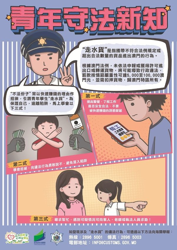 【即時新聞】為加強宣教普法工作,教青局聯同澳門海關、警務部門及教育團體等,設立“跨部門促進青少年成長保護網”,構建防止青少年涉及違法行為的預警機制。針對學生違法“走水貨”等高發風險問題,教青局持續與澳門海關定期入校開展普法講座,透過法律講解與真實案例分析,向學生清晰說明“走水貨” 對個人的嚴重影響,強化其拒絕被利用的自覺能力,確立堅守守法底線、遠離違法行為的價值觀。同時,因應清明及復活節等長假期,教青局聯同澳門海關共同在關閘口岸開展宣傳教育活動,藉以向青少年及家長宣教走水貨需負擔的個人責任和嚴重後果。