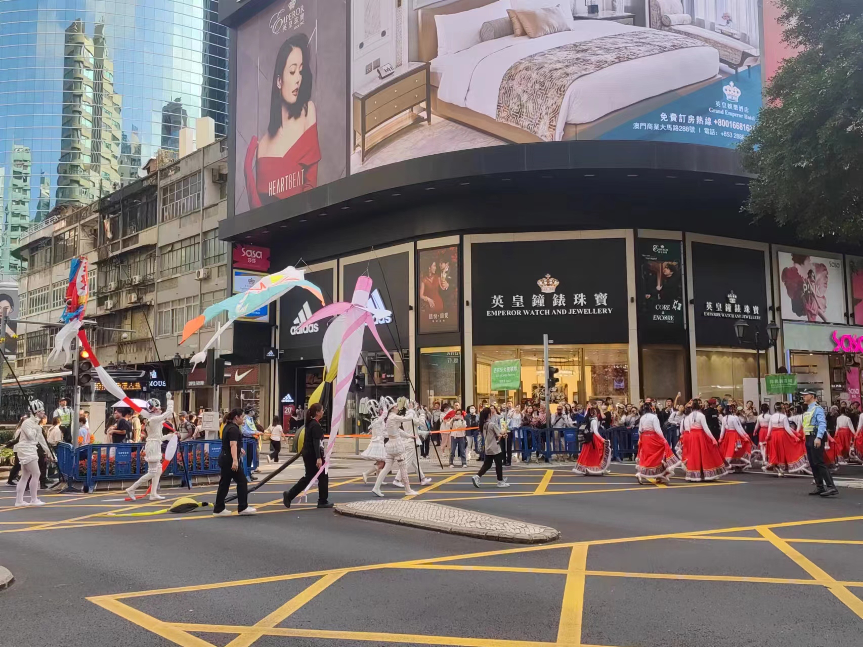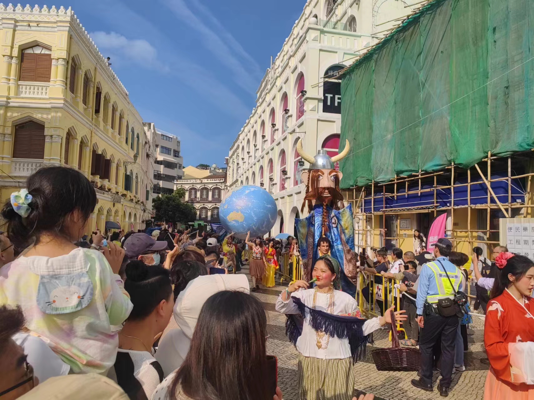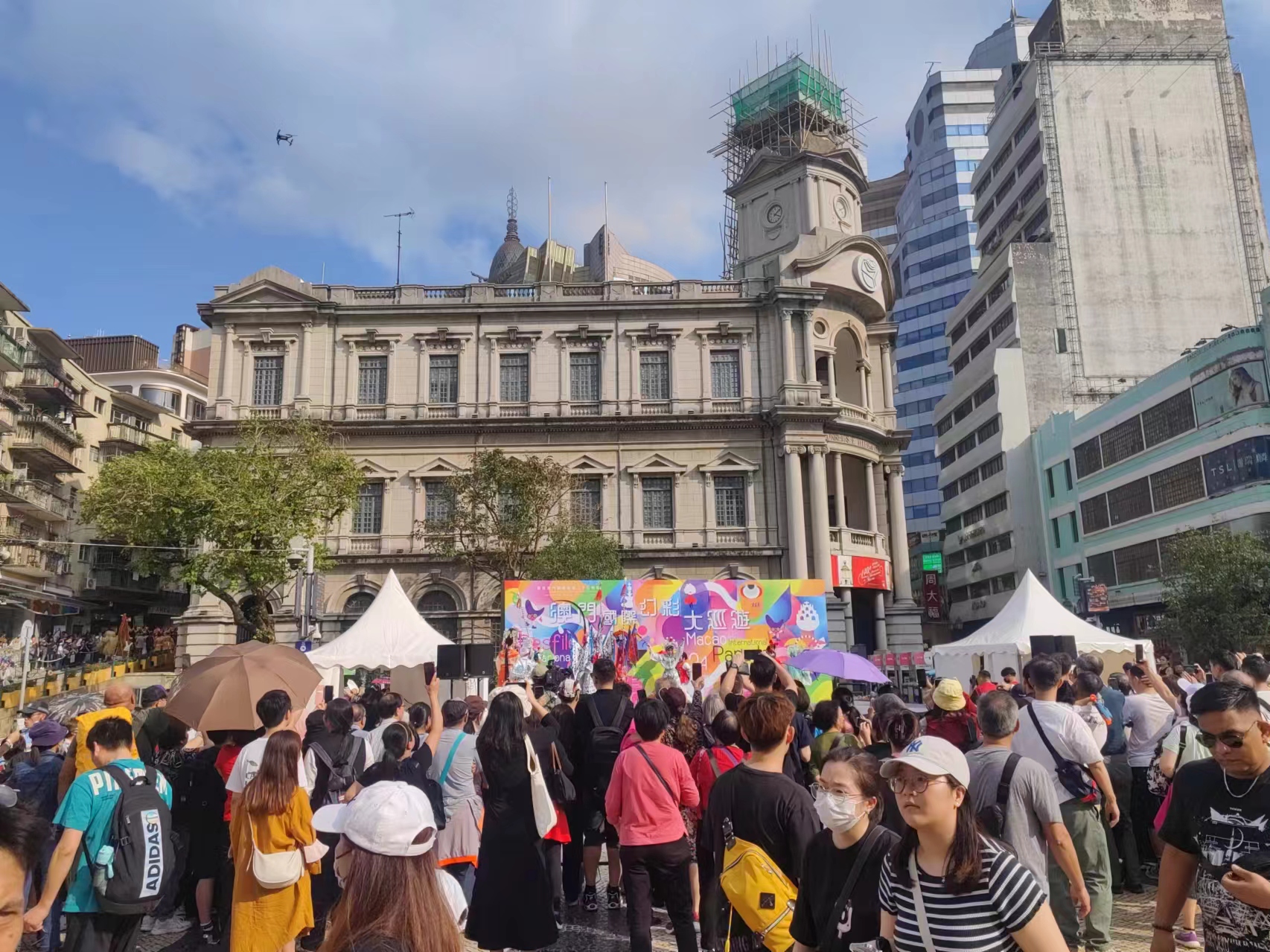 【即時新聞】澳門國際幻彩大巡遊下午三時大三巴牌坊開幕,巡遊隊伍經議事亭前地、大堂前地、南灣湖景大馬路,以及西灣湖廣場,沿途吸引大批市民旅客圍觀,人頭湧湧,大批保安和警員維持秩序。