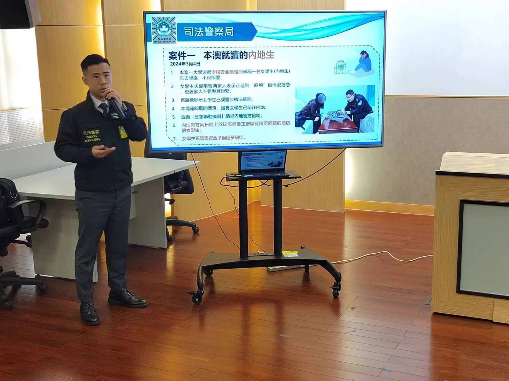 首宗案件顯示,本月4日,本澳一間大學透過學校安全聯絡網報稱一名內地女學生失聯,不知所蹤;而該名女學生失蹤前曾向家人表示正遇到「麻煩」且情況危急,更著家人不要與其聯繫;警方調查有跡象顯示女學生已誤墮公檢法騙局,隨即展開調查,證實女學生已前往內地,隨即透過「應急聯動機制」請求內地警方協助,內地警方同日晚上於珠海尋獲正按騙徒指示匿藏於酒店的女學生,女學生正籌集資金準備匯予騙徒,未有損失。