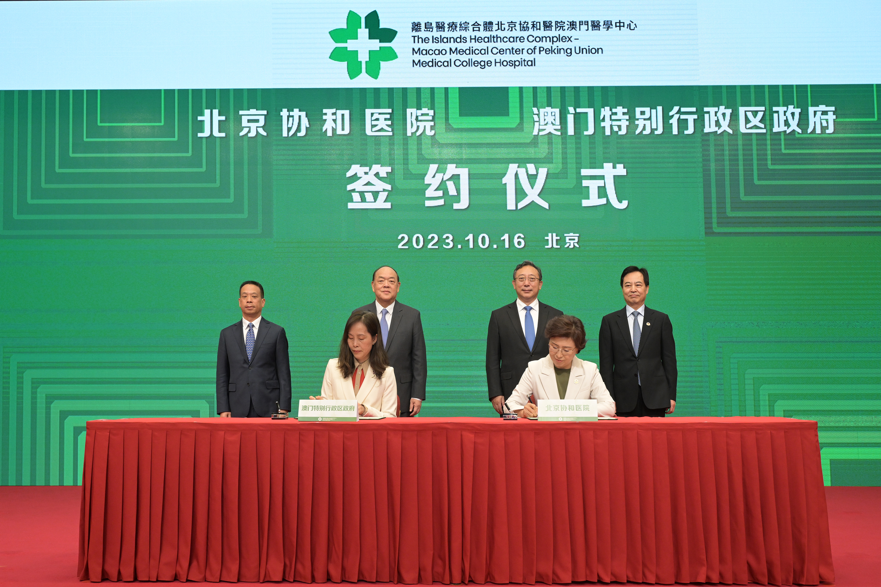 【特訊】在澳門特別行政區行政長官賀一誠,國家衛生健康委副主任曹雪濤,澳門中聯辦副主任黃柳權,北京協和醫院名譽院長、離島醫療綜合體北京協和醫院澳門醫學中心策略發展委員會主席趙玉沛共同見證下,澳門特別行政區政府社會文化司司長歐陽瑜與北京協和醫院院長張抒揚今日簽署《離島醫療綜合體北京協和醫院澳門醫學中心運營合作協議》。