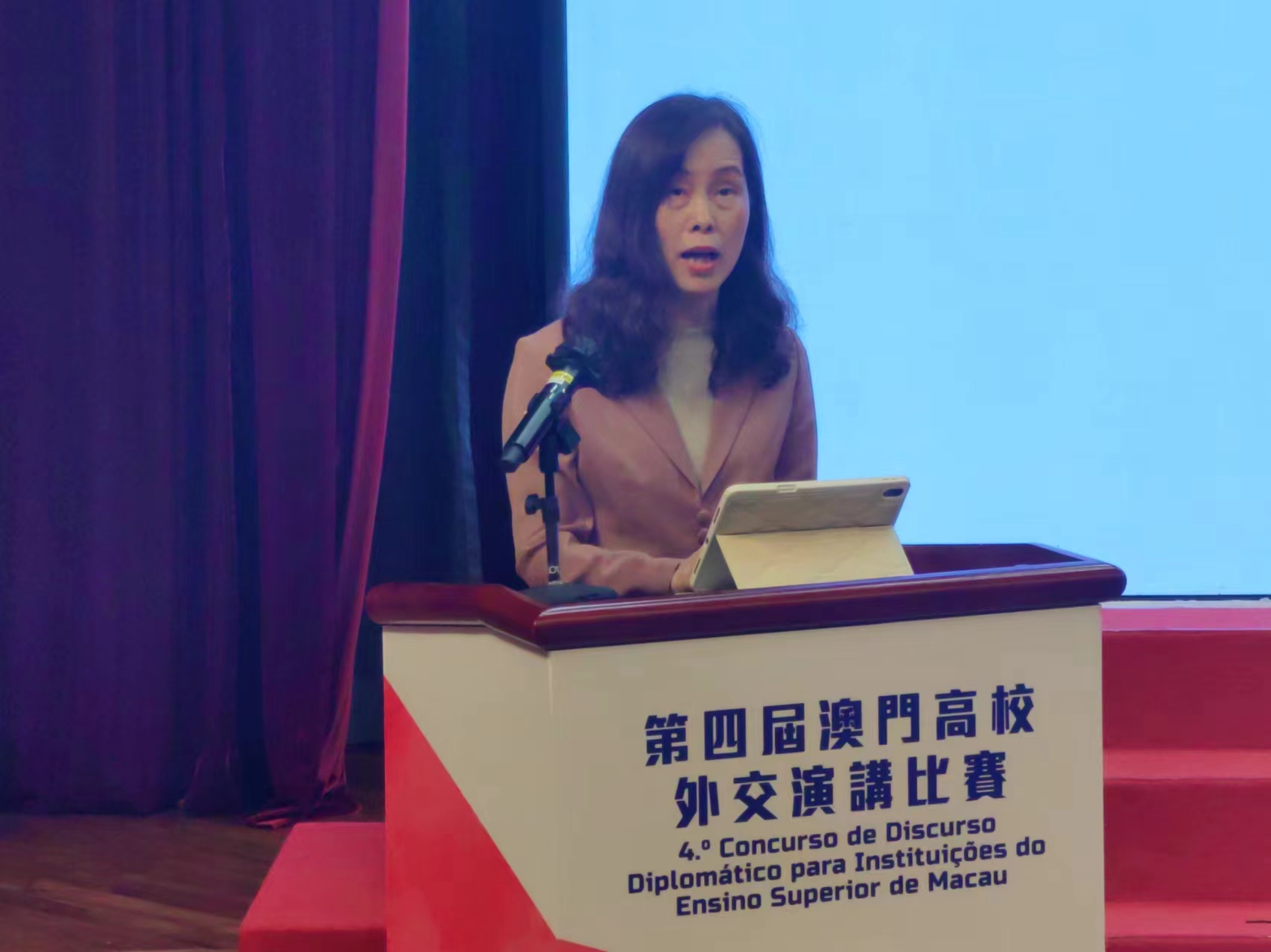 歐陽瑜致辭表示,一直以來,特區政府與外交部駐澳門特別行政區特派員公署攜手合作,以豐富多樣的形式培養青年學生的愛國愛澳情懷、加深對新國際形勢下的中國特色大國外交的認識。今天的比賽是其中一項高品質的品牌活動。近年,各所高校踴躍成為協辦單位,把賽事引進校園,發揮更大的影響力。讓人欣喜的是,各屆參賽同學在各方的指導下,認真學習,結合自身經歷,客觀認識國家的發展、深刻理解中國外交政策的戰略意義,在比賽中提升個人的綜合素質,表現出作為特區接班人、國家新一代的自豪和擔當。賽事已踏入第四屆,她感謝外交部駐澳門特別行政區特派員公署、中聯辦、駐澳部隊長期以來的關心和支持,感謝各高校、老師和同學的踴躍參與,期望同學以賽事為平台,不斷拓寬視野、增強個人能力,始終心懷祖國,以實際行動為澳門的繁榮發展、為中華民族偉大復興貢獻你們的智慧和力量。