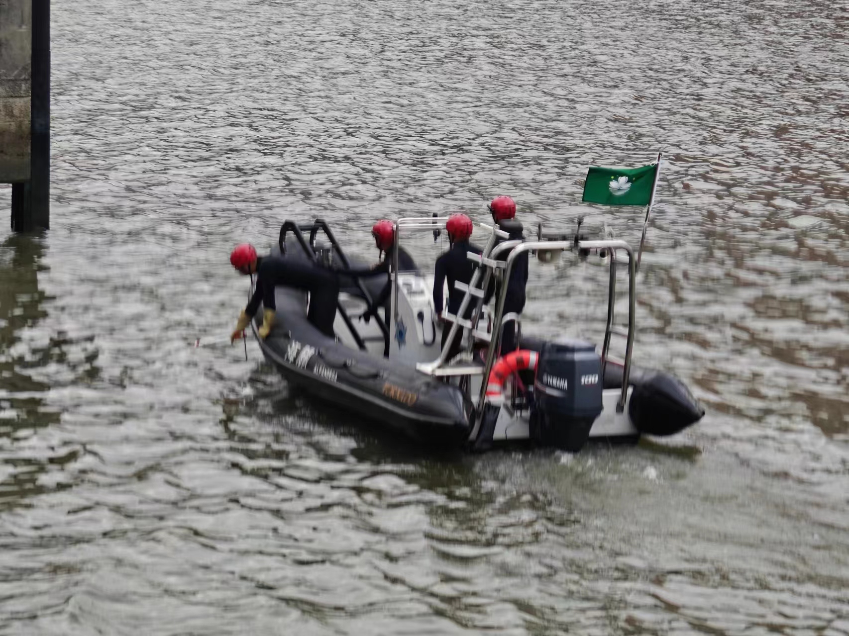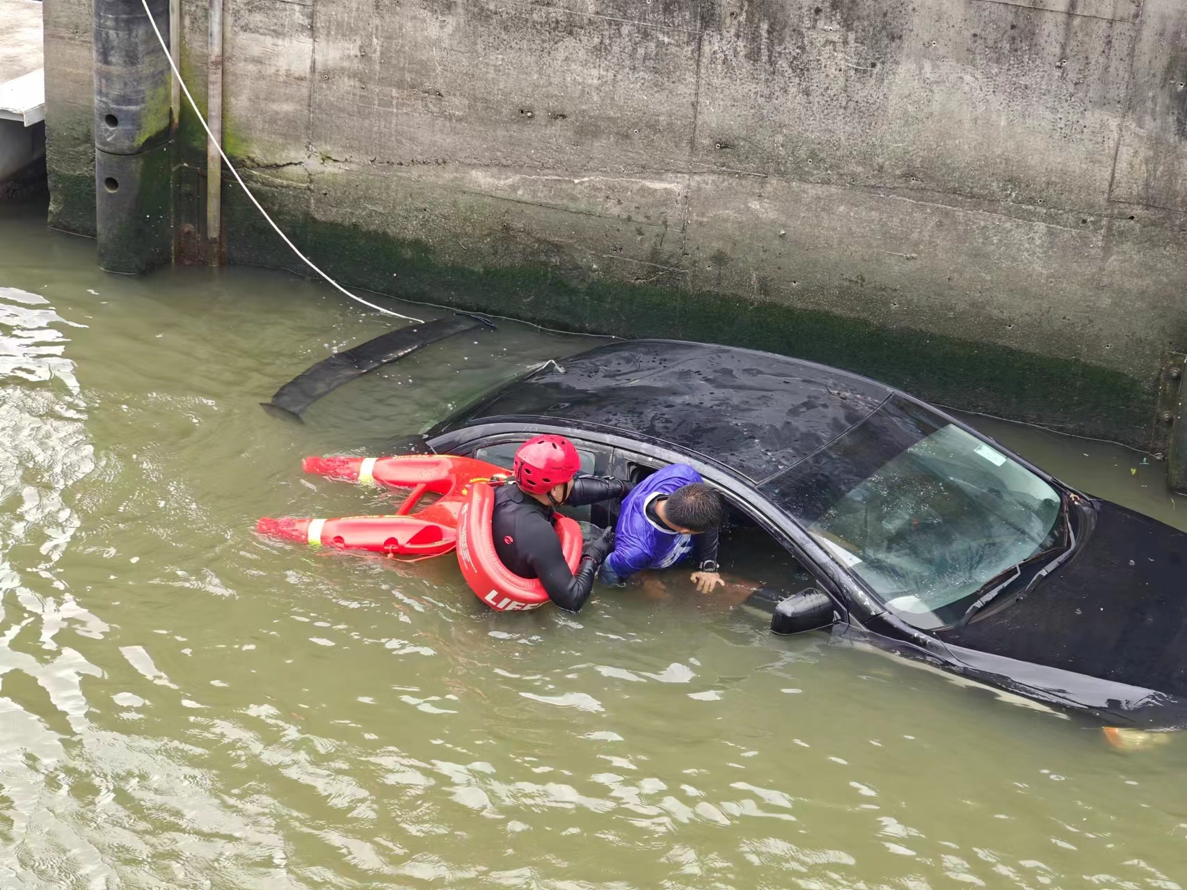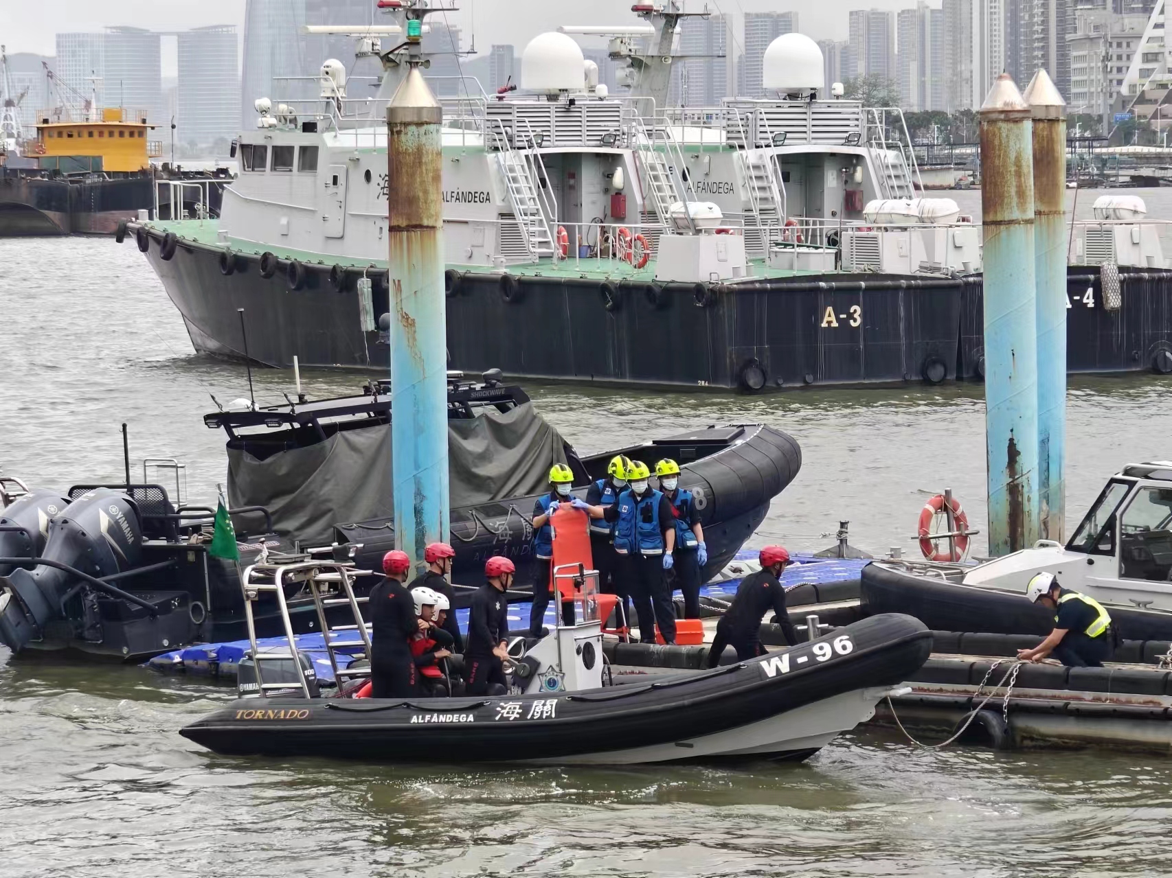 海關接報後經評估,派出4名潛水隊人員配備個人装備、救援装備及遙控動力救生圈,駕駛水上電單車連橡皮艇趕往現場。並通知消防局到最近的撤離點戒備。潛水隊人員到達事發現場附近,發現車顶上有1名男子正在呼救,並表示還有1名男子被困於車廂内。因涉事車輛附近街道均被雜物阻擋,水上電單車連橡皮艇無法前行。經分析後,認為情況緊急,2名潛水隊人員隨即下水游往涉事車輛,並利用遥控動力救生圈及破窗工具將2名被困男子救出,送到最近撤離點,交消防人員處理。