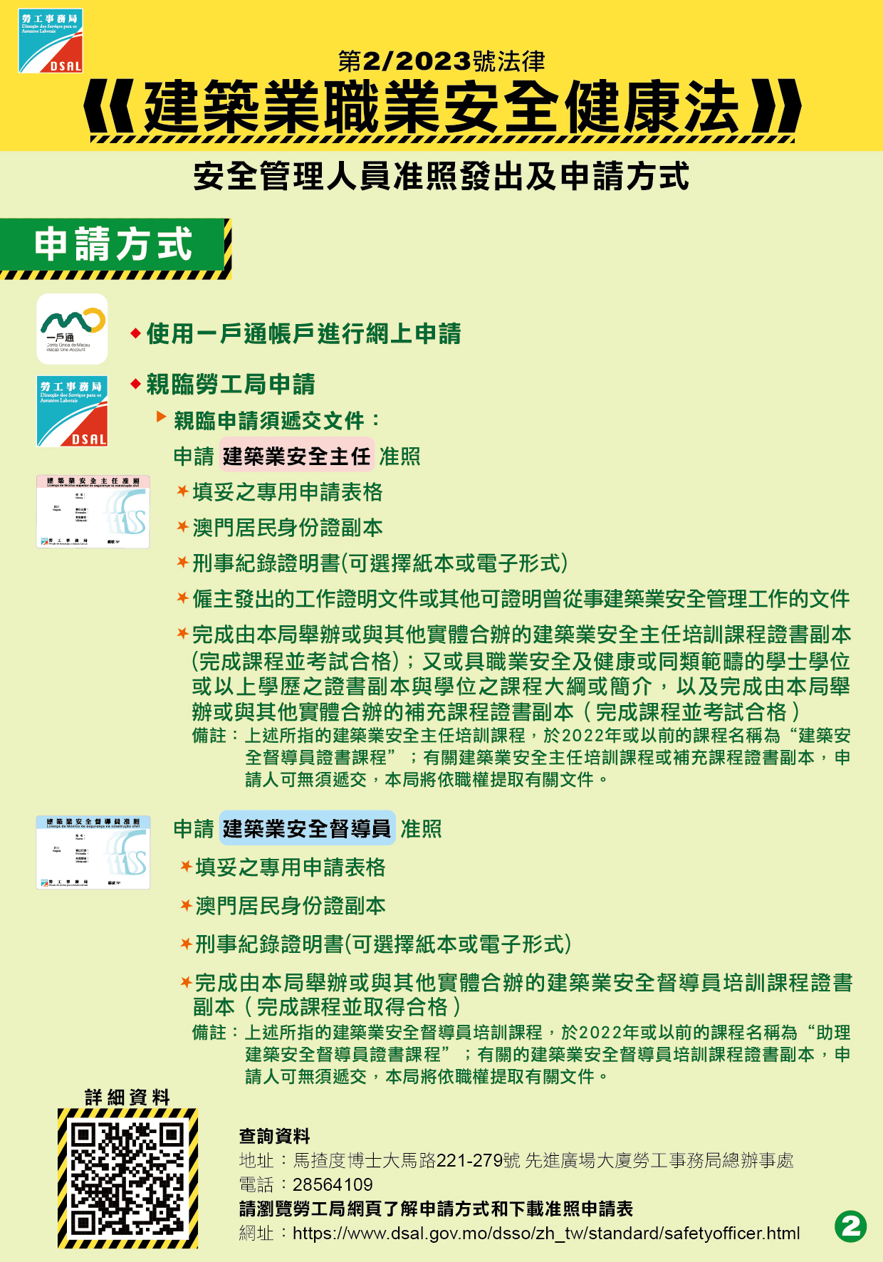 隨著《建築業職業安全健康法》即將於11月1日生效,勞工局提醒有意在11月1日後擔任安全管理人員而尚未申請准照的合資格人士,應盡快提出申請。符合資格人士可登入“一戶通”手機應用程式,選擇“建築業安全主任/安全督導員准照申請”,然後按照界面指示輸入資料及上載相關證明文件後,便可完成申請手續;申請人亦可親臨勞工局辦理申請手續,申請表格可於勞工局網頁下載或於勞工局辦事處索取(地址:馬揸度博士大馬路221-279號先進廣場大廈)。有關建築業安全主任和安全督導員准照申請詳情,可瀏覽勞工事務局網站www.dsal.gov.mo或於辦公時間內致電28717781查詢。有關“一戶通”的申請手續,可瀏覽政府入口網站(www.gov.mo)。