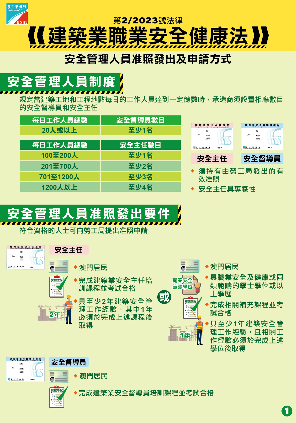 該法律規定承造商須按建築工地和工程地點的每日工作人員總數設置相應數目的安全管理人員,以協助承造商做好安全管理的工作,而安全管理人員須由承造商聘用。安全管理人員是指按照法律規定設置的安全主任和安全督導員,有關人員必須持有由勞工局發出的有效准照,方可在建築工地和工程地點擔任職務。按照規定,同一工地內每日的工作人員總數達二十人或以上時,承造商須僱用最少一名持有有效准照的安全督導員;工作人員總數達一百人或以上時,承造商須同時僱用持有有效准照的安全主任。此外,承造商須按工作人員總數的遞增而僱用至少相應數目且持有有效准照的安全主任。