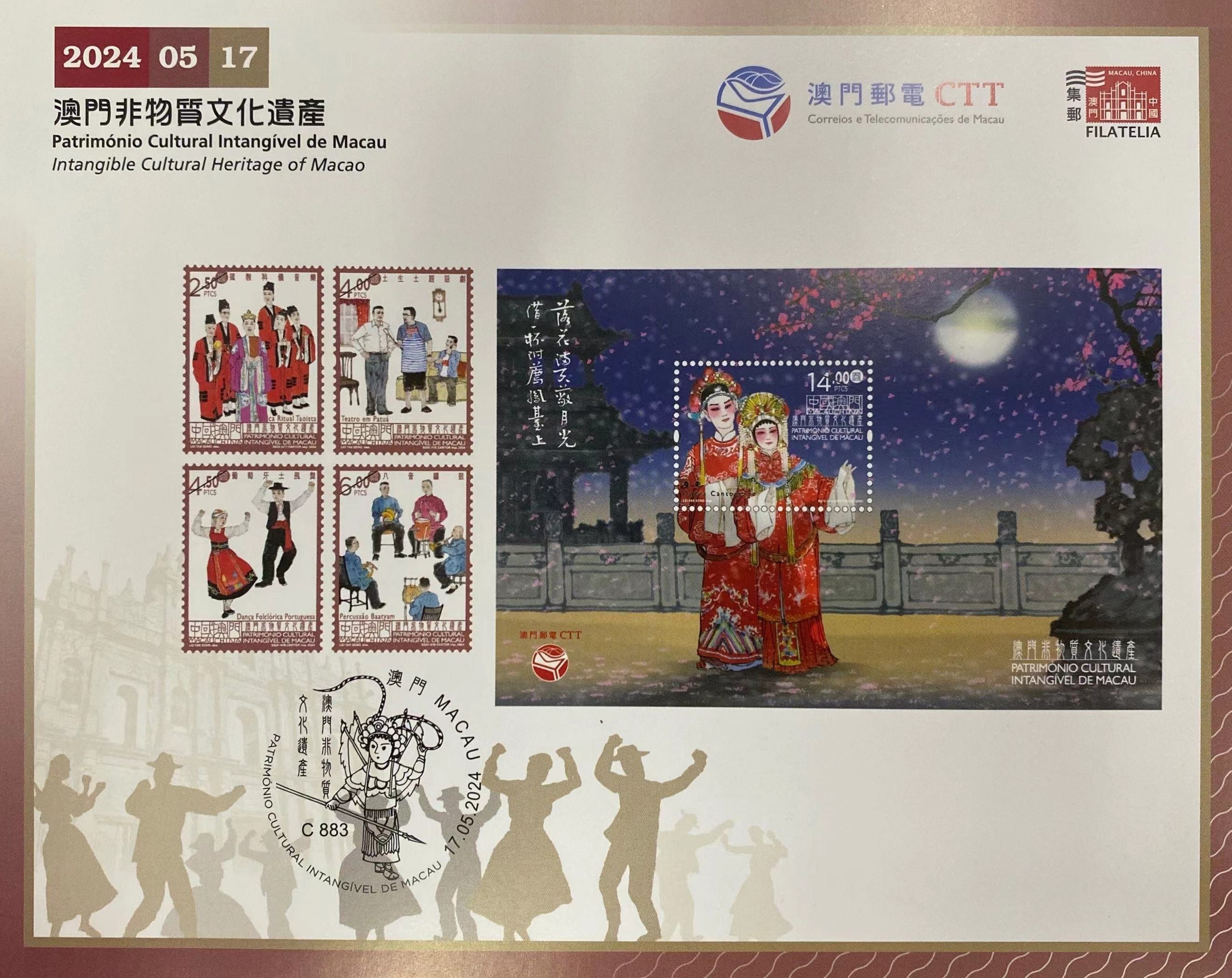 【即時新聞】郵電局將於5月17日發行以“澳門非物質文化遺產”為題的新郵品。是次發行的一套四枚郵票選取四項不同的表演藝術類項目作為郵票的主題,分別是2011年及2021年列入《國家級非物質文化遺產代表性項目名錄》的“道教科儀音樂”及“土生土語話劇”;以及2020年列入《澳門非物質文化遺產清單》的“葡萄牙土風舞”及“八音鑼鼓”。圖案呈現出每項表演的特質,同時彰顯中西文化的和諧共融。整套四枚郵票售價為17元,連郵票首日封售價為23元,連小型張首日封售價為20元,連郵票資料單張售價為24元及連小型張資料單張售價為21元。