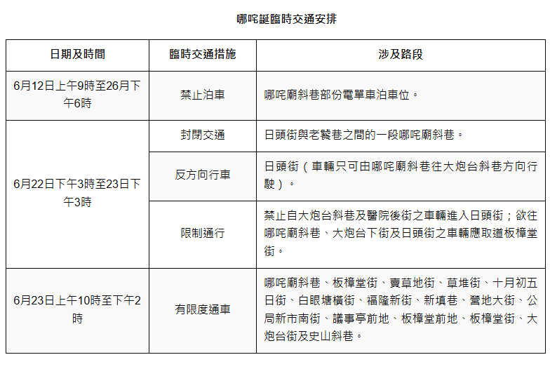 【即時新聞】配合澳門柿山哪咤古廟值理會舉辦活動,板樟堂一帶道路於6月12日(周三)至26日(周三)實施臨時交通安排,其中哪咤廟斜巷部份路段於6月22日至23日實施封閉交通,交通事務局呼籲公眾留意。