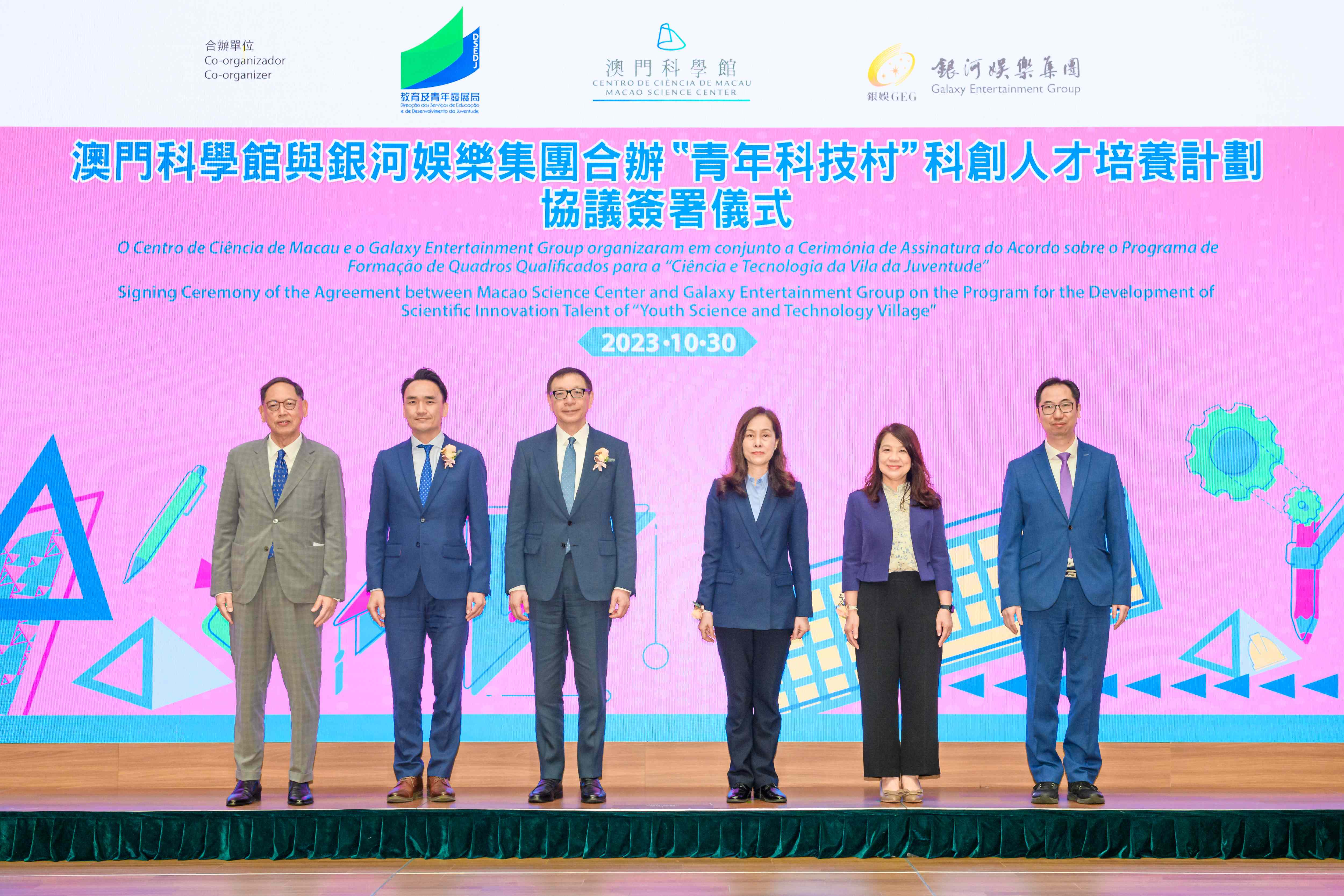 10月30日,在社會文化司司長歐陽瑜,社會文化司司長辦公室主任何鈺珊,教青局局長、澳門科學館股份有限公司股東會主席龔志明,以及銀娛副主席呂耀東的見證下,澳門科學館館長邵漢彬與銀娛董事程裕昇就「青年科技村」科創人才培養計劃簽署協議書。
