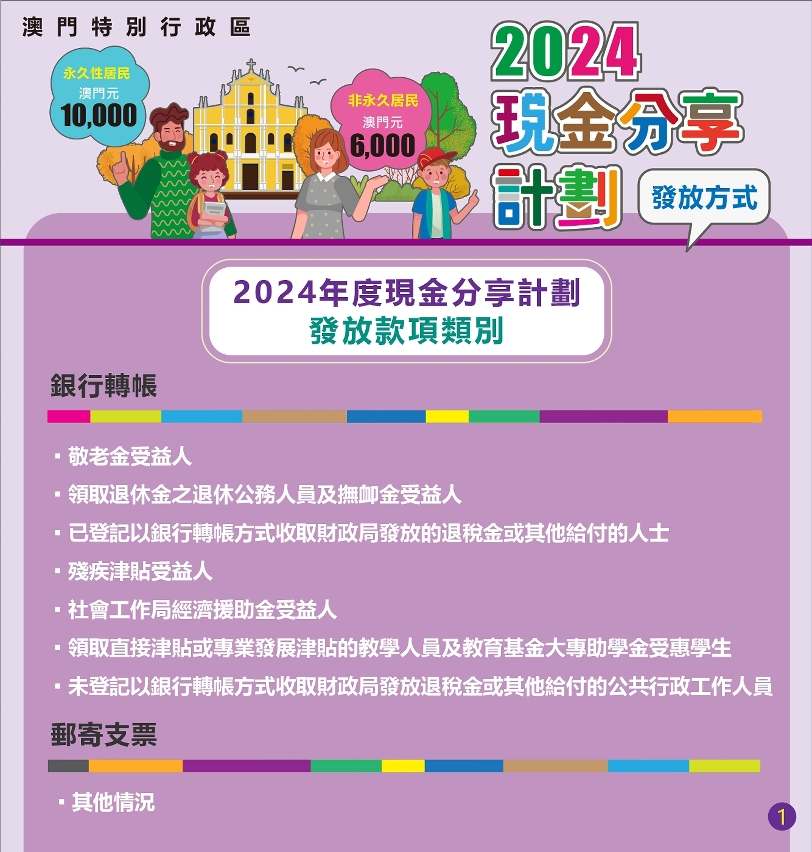 (1)敬老金受益人、(2)領取退休金之退休公務人員及撫卹金受益人、(3)已登記以銀行轉帳方式收取財政局發放退税金或其他給付的人士、(4)殘疾津貼受益人、(5)社會工作局經濟援助金受益人、(6)領取直接津貼或專業發展津貼的教學人員及教育基金大專助學金受惠學生、(7)未登記以銀行轉帳方式收取財政局發放退税金或其他給付的公共行政工作人員,以上凡合資格獲發放2024年度現金分享計劃款項之人士,將透過銀行轉帳形式發放。