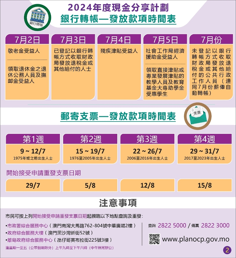 【即時新聞】《2024年度現金分享計劃》將自明天(7月2日)起至7月31日透過銀行轉帳或郵寄劃線支票兩種方式,有序向717,018名合資格的澳門永久性居民每人發放1萬澳門元,以及向30,850名合資格的非永久性居民每人發放6千澳門元。