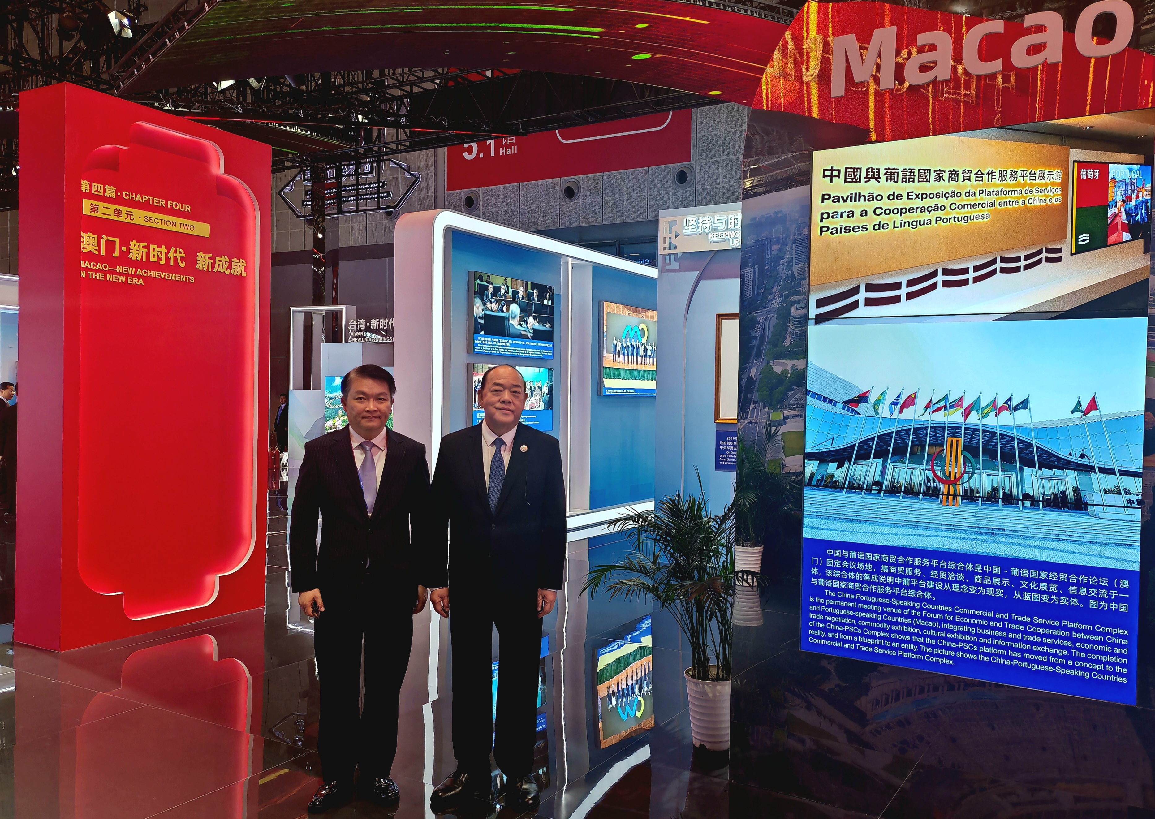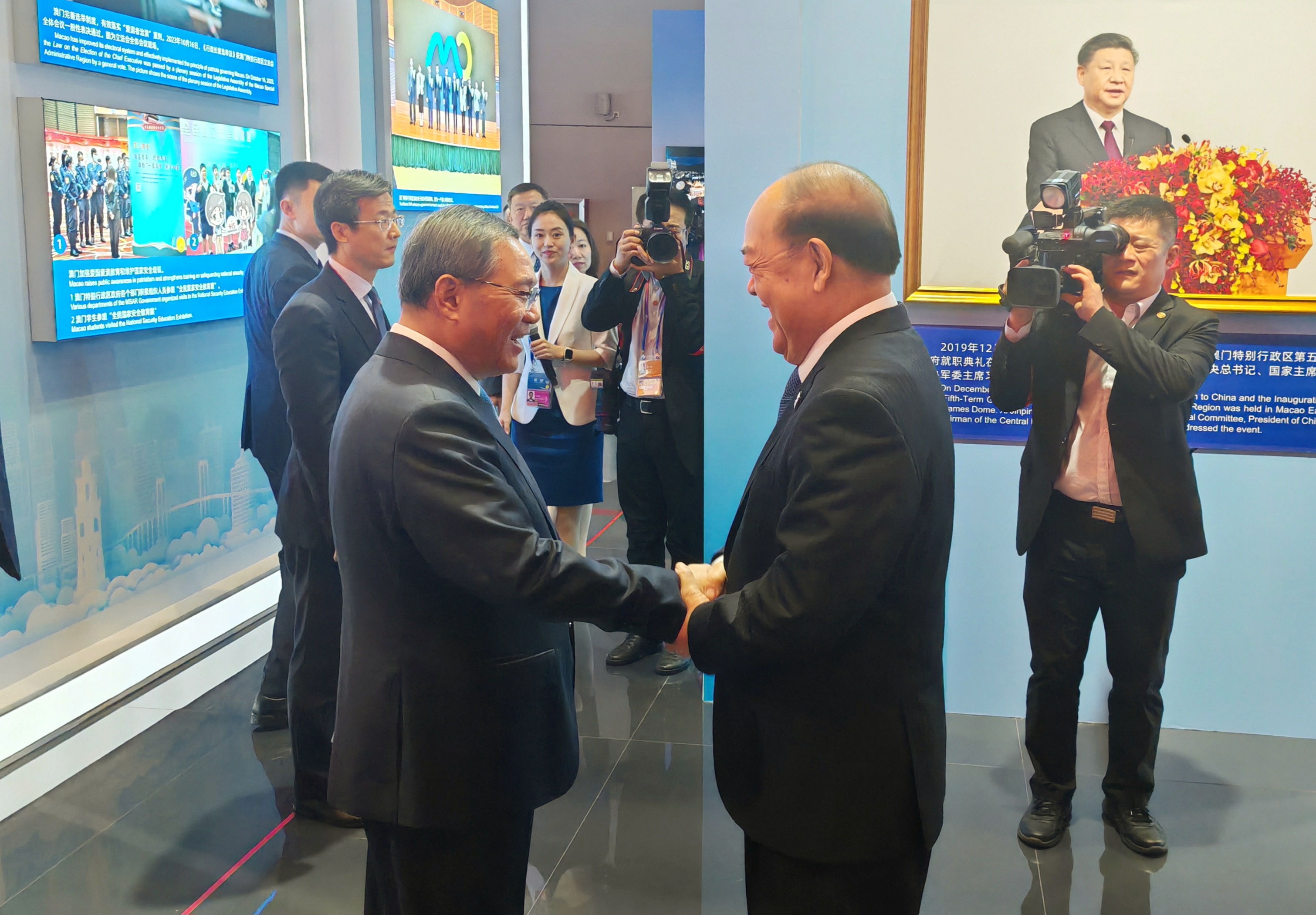 行政長官開幕式後在中國館澳門展區,向李強總理等介紹澳門展區內容及澳門的整體發展現況。澳門展區的主題為“澳門‧新時代 新成就”,展示了“堅持與時俱進,提升治理水平”、“堅持開拓創新,推動經濟持續健康發展”及“展望澳門未來發展藍圖”三大主要內容。