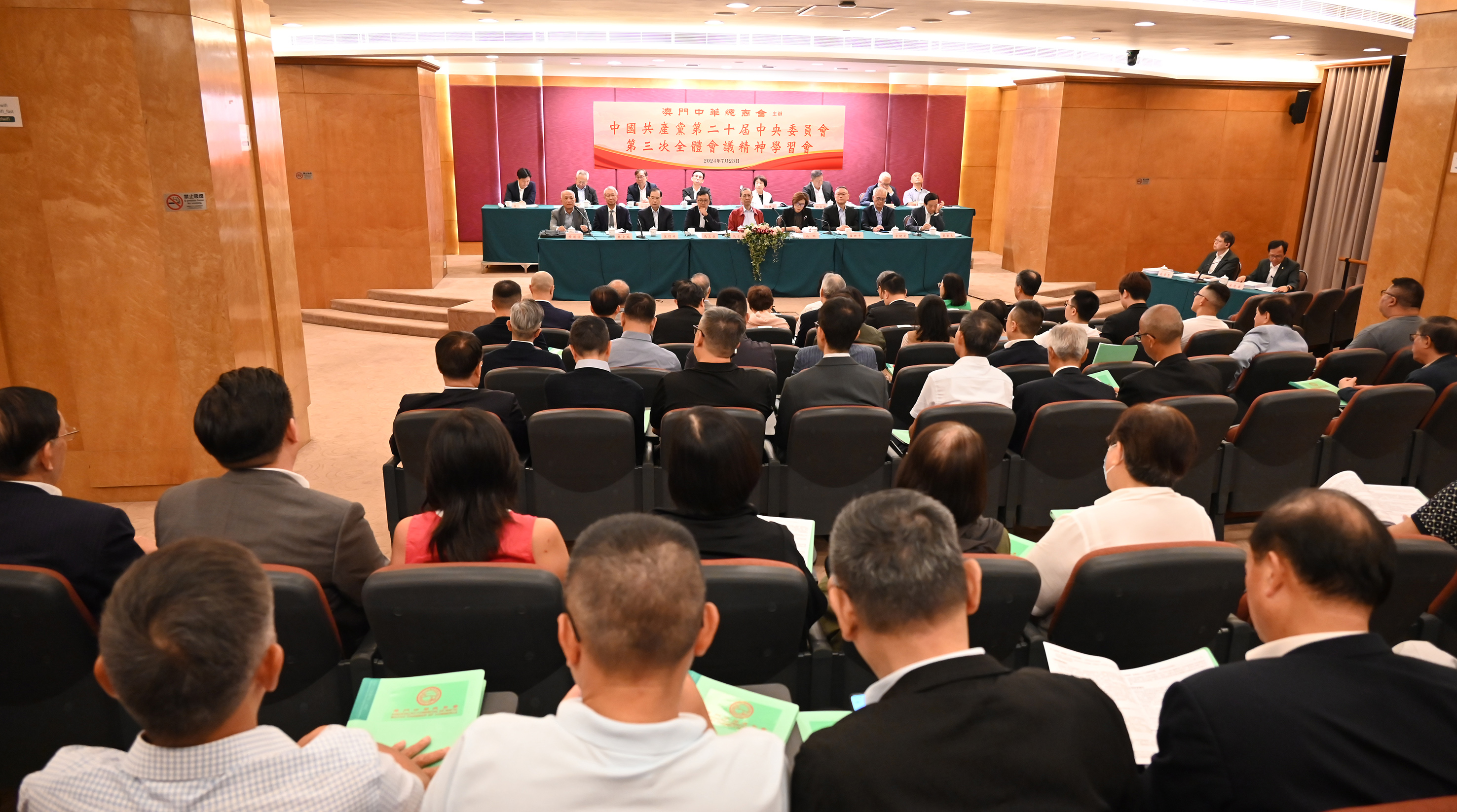 【即時新聞】澳門中華總商會於今晚在會址舉行了「中國共產黨第二十屆中央委員會第三次全體會議精神學習會」。會議由該會理事長馬志毅主持,邀請了澳門特區行政會委員楊道匡擔任主講嘉賓,向與會的會長、會董、理事、監事分享他對二十屆三中全會精神的解讀。中總永遠會長馬有禮,監事長高明,副理事長崔煜林、崔世平、林金城、余健楚、劉藝良、何佩芬、黃樹森、何富强、徐達明、蕭志偉、葉兆佳,副監事長黃如楷、劉永誠,會董蕭婉儀、杜琪新、關小冰、邱金海等近百人出席了學習會。