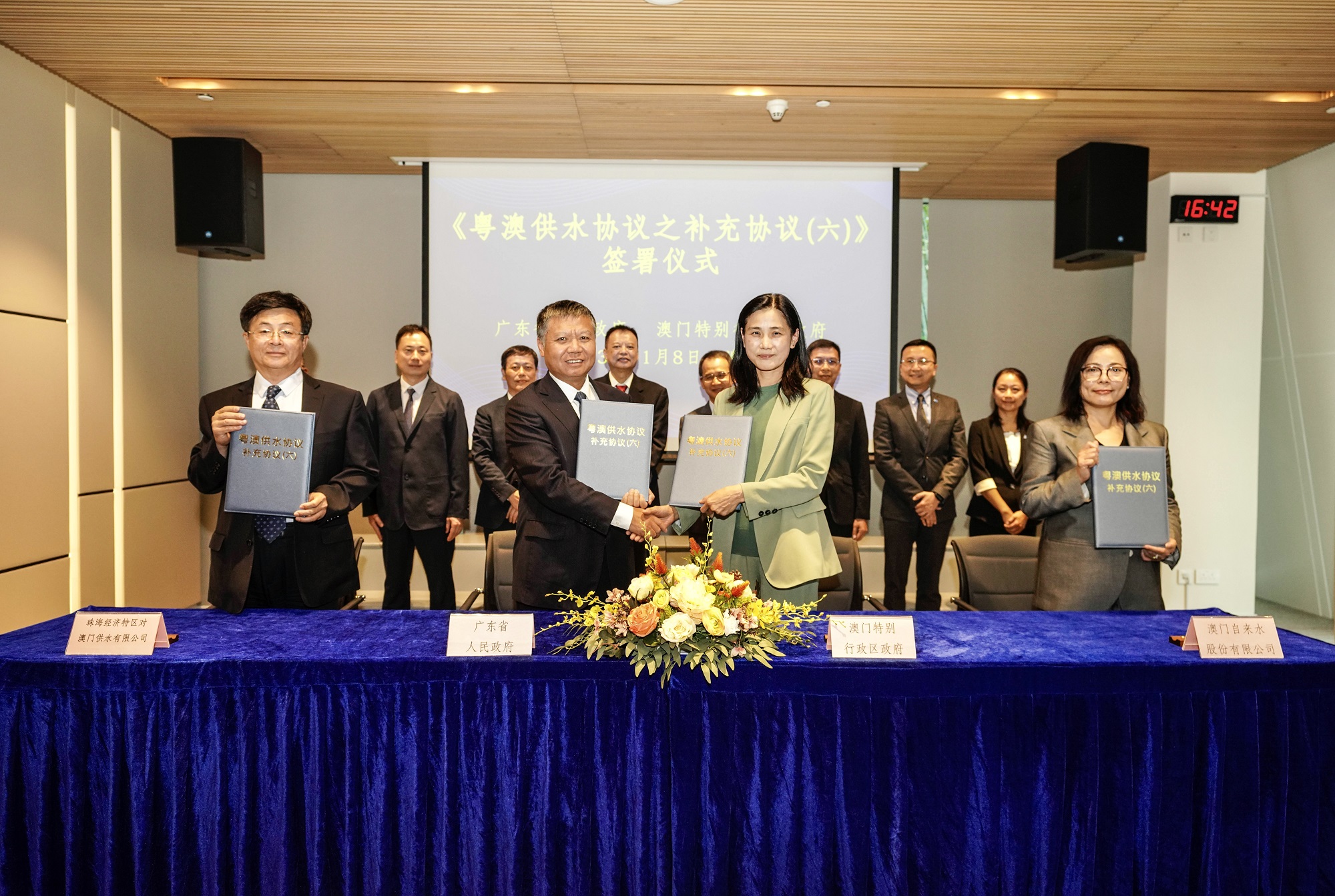 粵澳雙方代表週三(8日)於澳門海事及水務局大樓簽署《粵澳供水協議之補充協議(六)》,廣東省人民政府代表廣東省水利廳廳長王立新、澳門特別行政區政府代表海事及水務局局長黃穗文、珠海經濟特區對澳門供水有限公司董事長李永海和澳門自來水股份有限公司執行董事關小冰出席儀式並簽署補充協議。