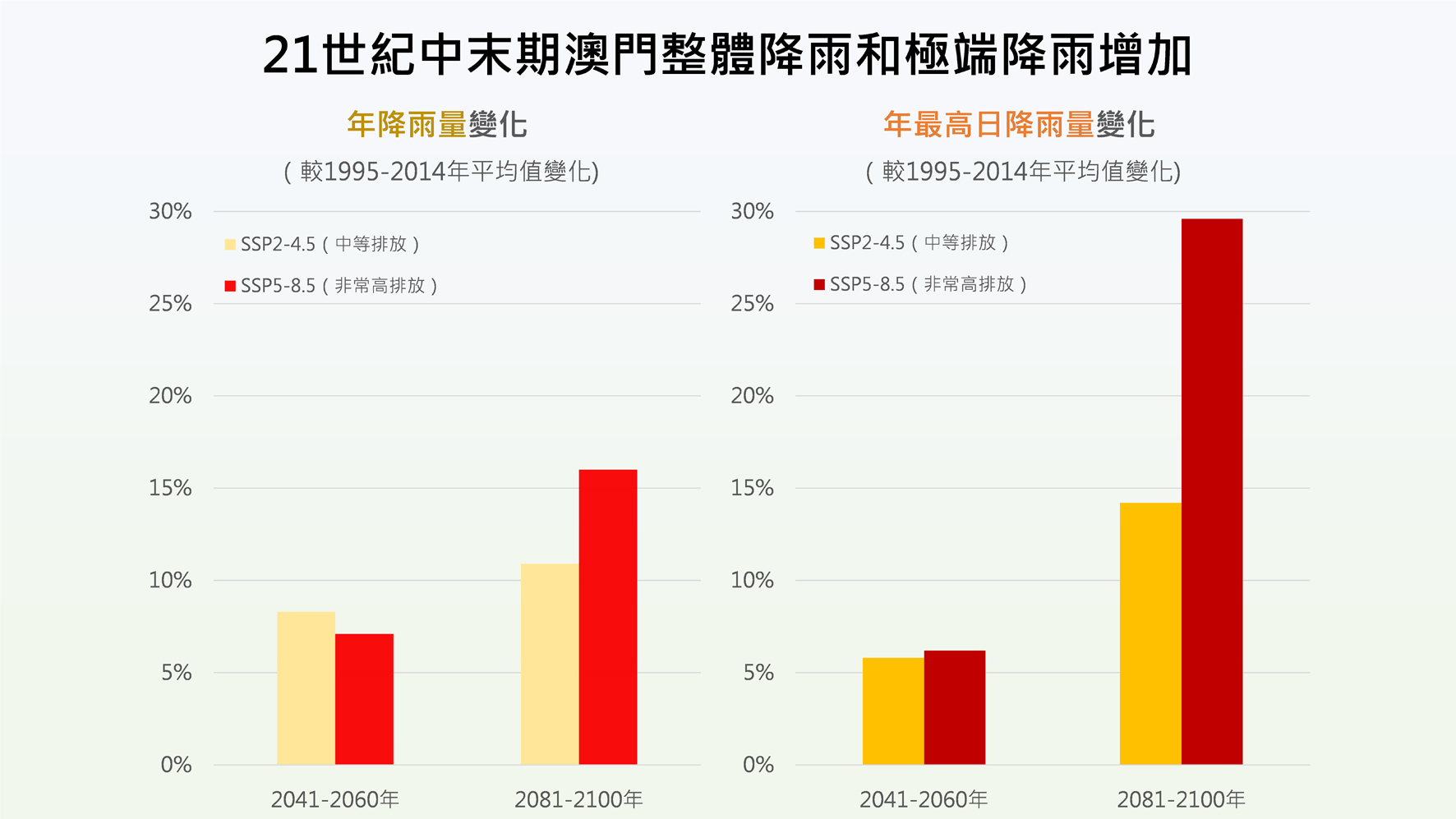 無論是中等排放情景或非常高排放情景,研究顯示,澳門的整體降雨量和極端降雨事件將有所增加。預測在中等排放情景下,21世紀中期(2041-2060年)澳門的年降雨量和年最高日降雨量將分別較1995-2014年的平均值增加約8.3%和5.8%;非常高排放情景下,21世紀末期(2081-2100年)的年最高日降雨量將增加約30%,反映極端降雨顯著增加。海平面上升方面,預測2041年至 2060年本澳的海平面高度平均值將較 1995-2014年上升約 0.31米,至 2081年至2100年則上升約 0.64米,加劇本澳受天文大潮和風暴潮影響。