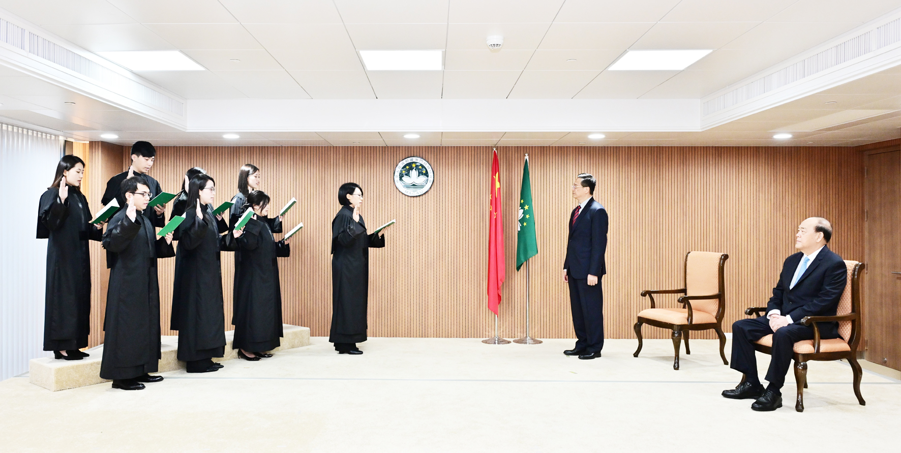 【特訊】檢察院新任檢察官就職典禮昨日下午四時三十分假檢察院大樓七樓多功能室舉行,在行政長官賀一誠主禮,檢察長葉迅生監誓下,八名新任檢察官李莉、梁雯雲、李湘漪、鄭百成、黃馨悅、曹倩婷、王輝、鄺綺婷宣誓就職及簽署就職狀。