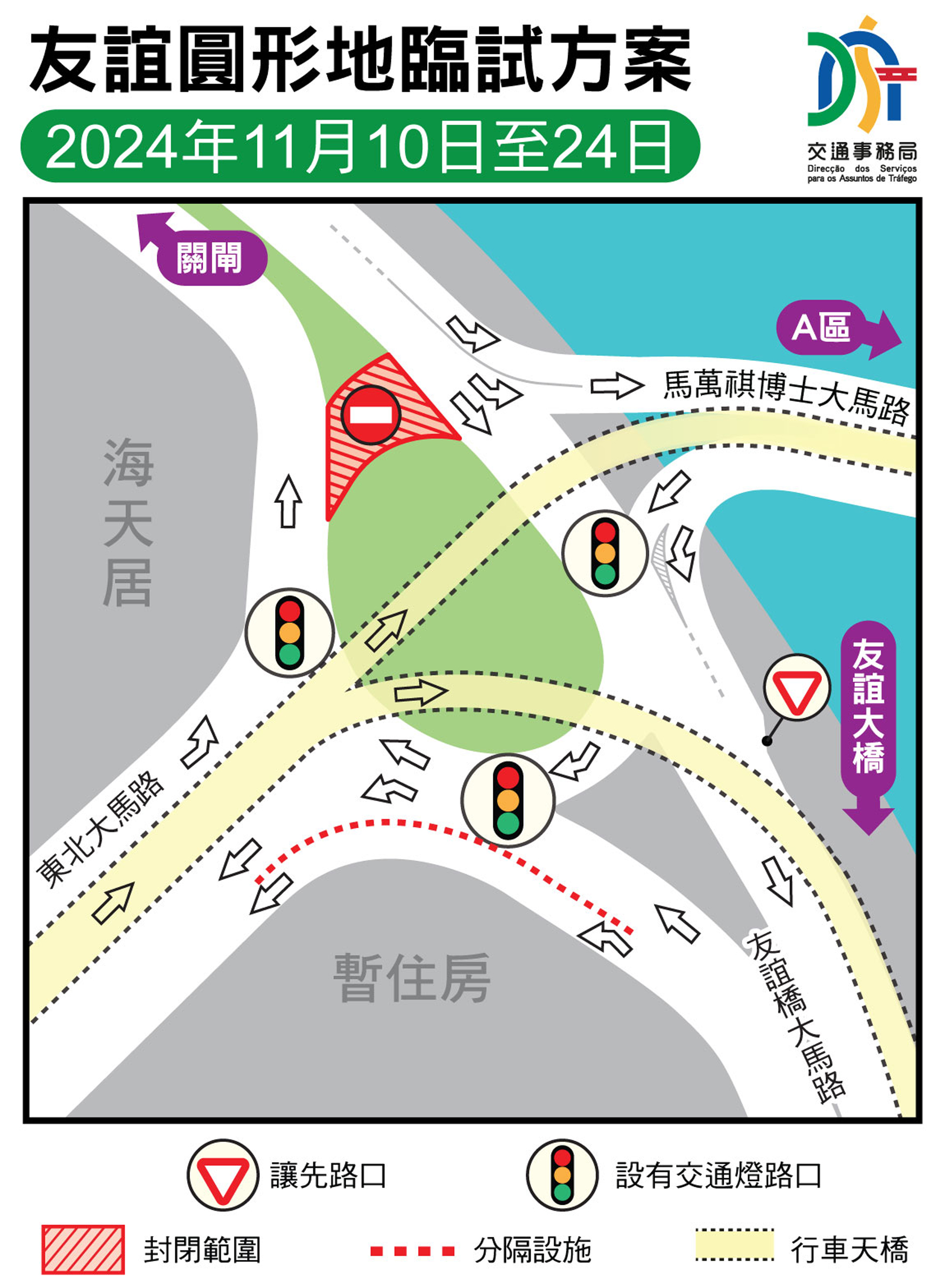 考慮到澳門大橋開通後,現時由友誼大橋經友誼圓形地轉往A區的車流有所減少,經分析車流數據並藉著大賽車優化賽道附近交通安排的機會,於11月10日(週日)上午10時至11月24日,試行封閉友誼圓形地地面轉往新城A區的路段,同時取消關閘往友誼圓形地方向、近進入馬萬祺博士大馬路路口的交通訊號燈。局方預計上述臨時交通方案再配合A2連接橋的啟用,可提升該區整體通行效率。屆時,友誼圓形地的交通訊號燈配時以及路面標線會作調整;友誼橋大馬路向關閘方向的車輛,如需前往新城A區或仔方向,需繞經勞動節街、黑沙環中街和東北大馬路前往友誼圓形地行車天橋。局方會密切留意有關臨時試行方案的實施情況和成效,適時調整細節,以評估有關路段日後的恆常交通安排。