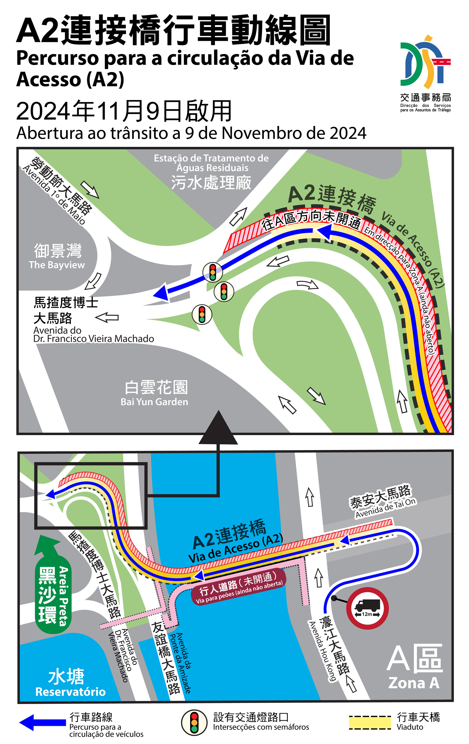 吳洪表示,為提升跨區通行能力及提前讓駕駛者在大賽車舉行前熟習相關交通安排,A2橋將於11月9日(週六)開通由A區往澳門半島方向的車行道,屆時,車輛(僅限車長不超過12米車輛)可由濠江大馬路近泰安大馬路的入口進入A2橋,經設於馬楂度博士大馬路(介乎污水處理廠和白雲花園)的出口往澳門其他區域,具體請參閱行車安排示意圖。目前,由於泰安大馬路部份路段仍在進行共同管道及道路施工,故短期內車輛未能由澳門半島通往A區。A2橋由黑沙環往A區方向的車行道將配合A區工程的施工進度適時開放。同時,為避免由漁翁街及友誼大馬路來車與A2橋車流的衝突,局方在A2橋近馬楂度博士大馬路的出口增設交通燈控制路口,以控制北向和東西向的來車有序通行,而往馬楂度博士大馬路方向則不受燈控影響。