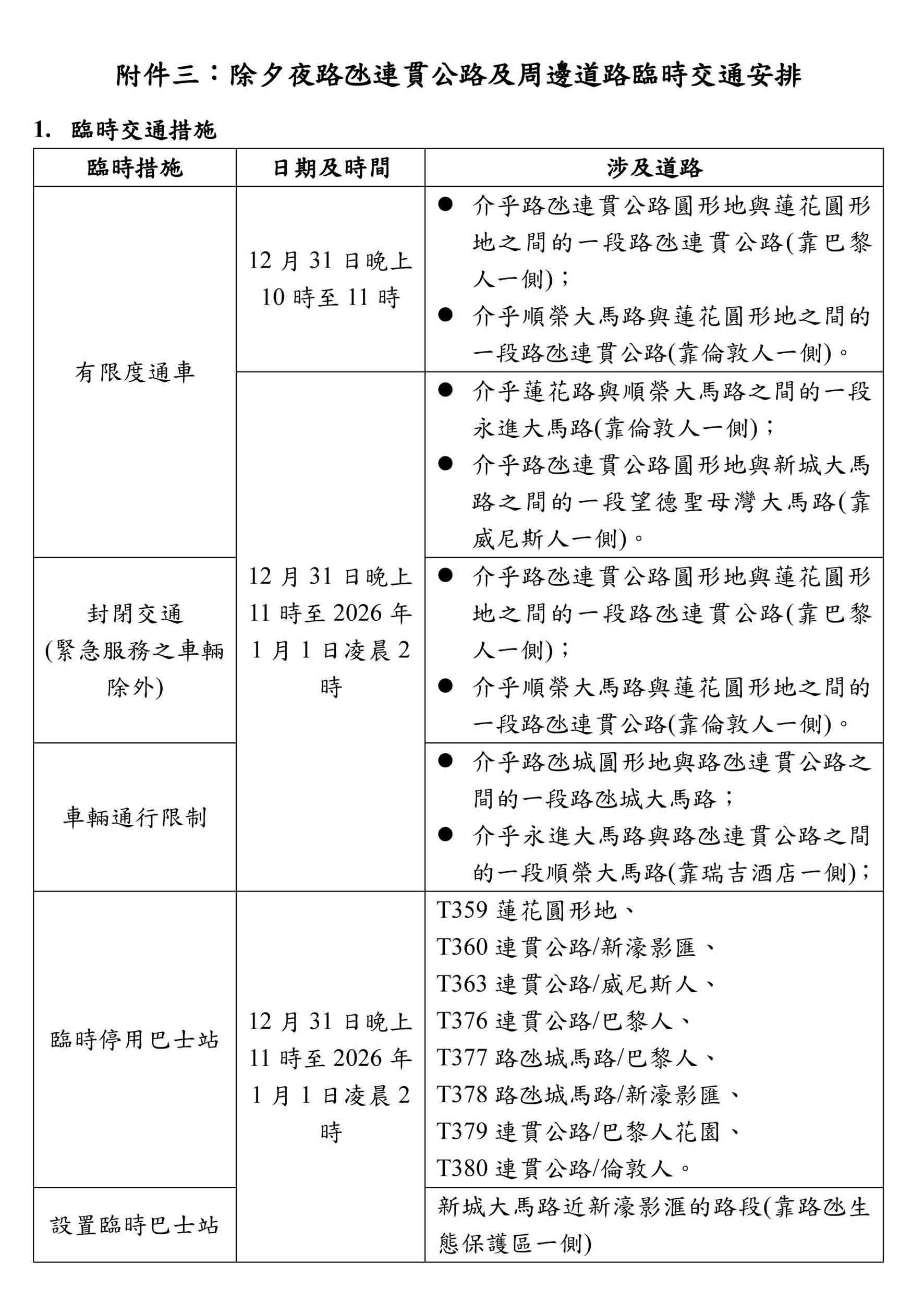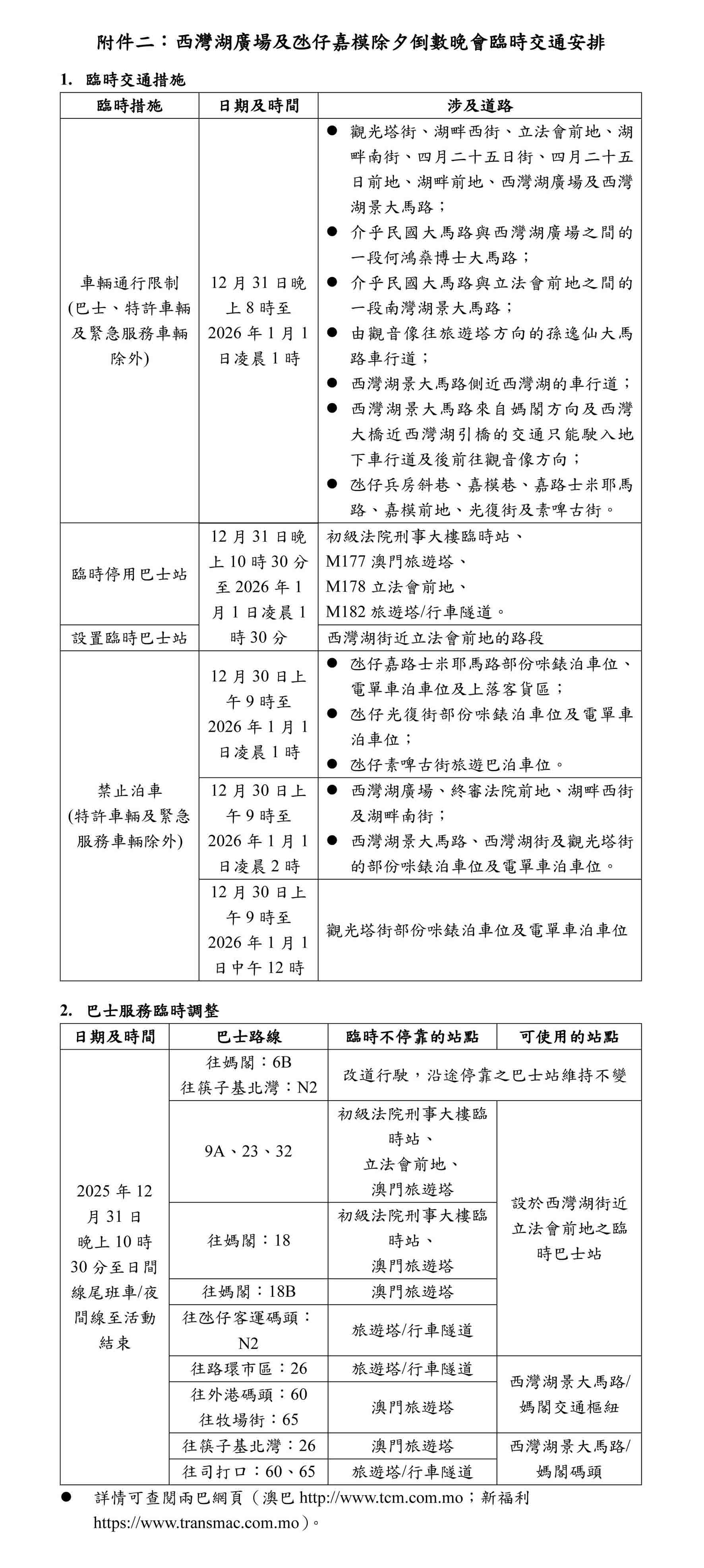 因應西灣湖廣場、氹仔龍環葡韻及金光大道分別舉行除夕晚會及倒數活動,12月31晚上8時至元旦日凌晨時段,西灣湖廣場一帶、氹仔嘉模周邊道路及路氹連貫公路均會實施道路通行限制,部份巴士站點和旅遊塔的士站將臨時調整,途經之多條巴士路線改道行駛及調整停靠站點。