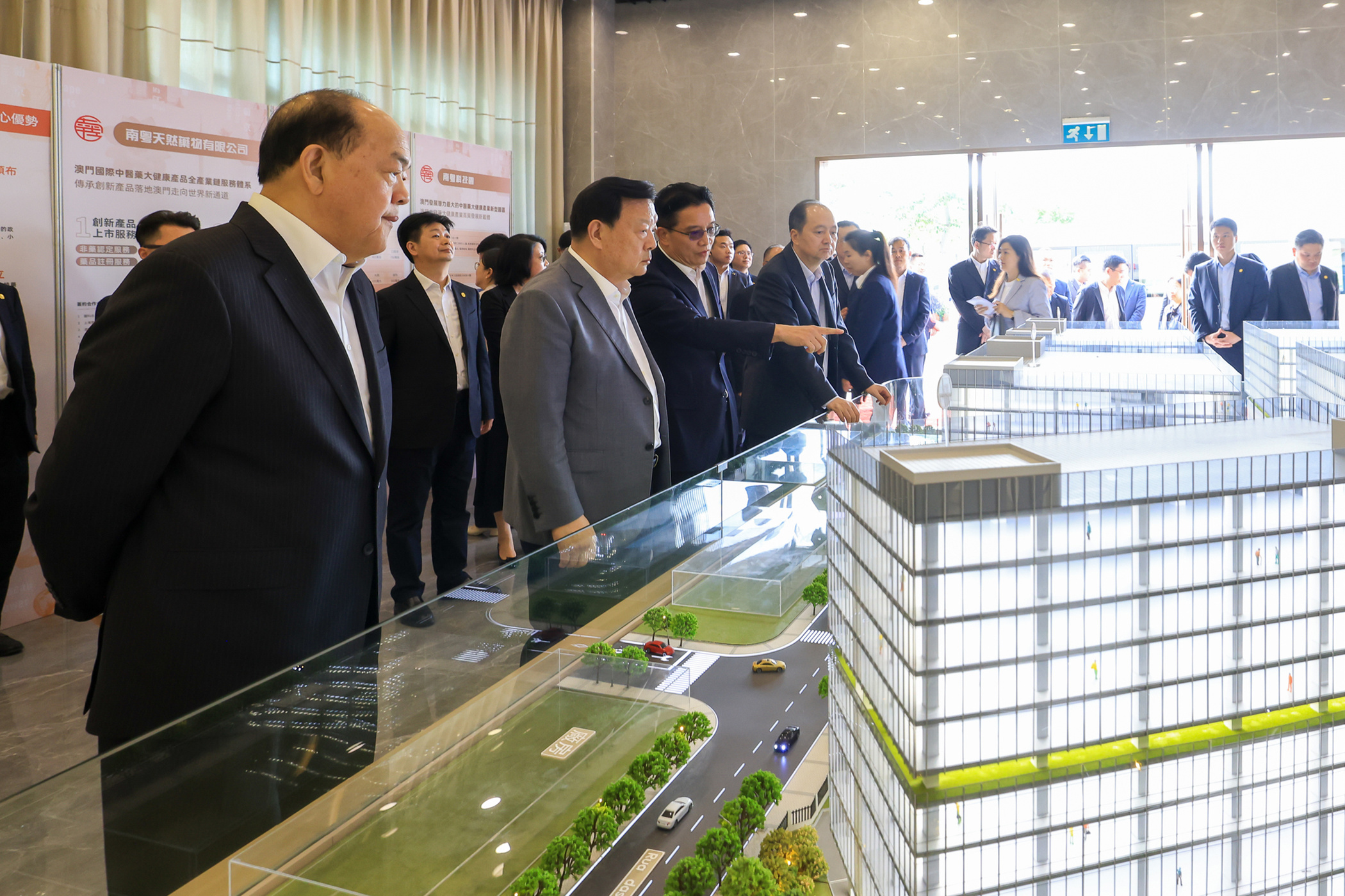 夏寶龍和賀一誠隨後轉往南粵科技園,在經濟財政司司長李偉農陪同下聽取園區營運情況的介紹,到中藥廠考察生產設備及相關流程,並走訪調研園內「澳門品牌」、「澳門製作」及土生土長本澳企業的發展情況。