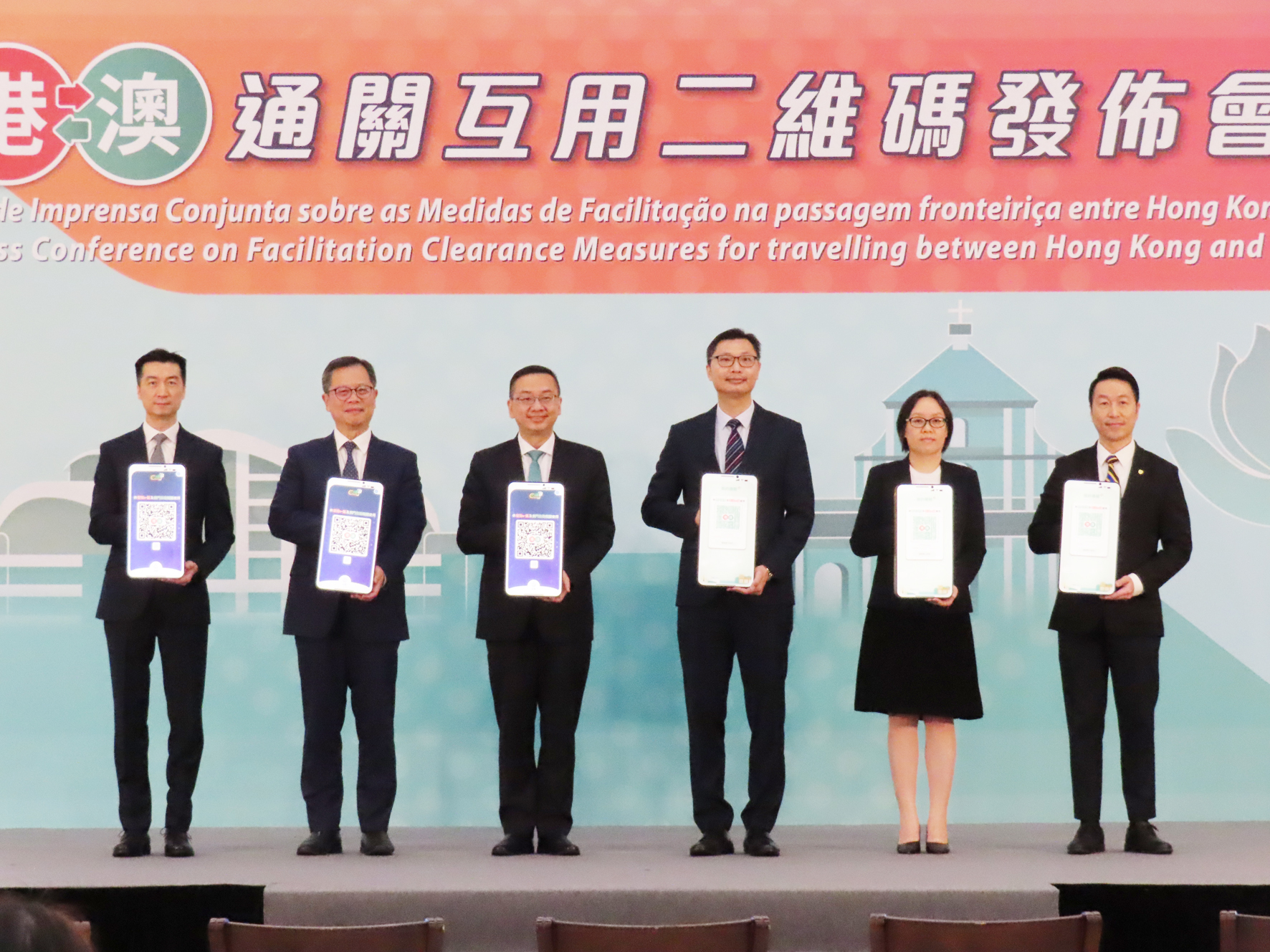 兩地政府昨日上午十時半假港珠澳大橋澳門邊檢大樓舉行「港澳通關互用二維碼」發佈會,啟動儀式由香港入境事務處處長郭俊、澳門身份證明局局長周偉迎、澳門行政公職局局長吳惠嫻、澳門治安警察局代局長黃偉鴻、香港入境事務處副處長戴志源及香港入境事務處助理處長柯重鈺主禮。