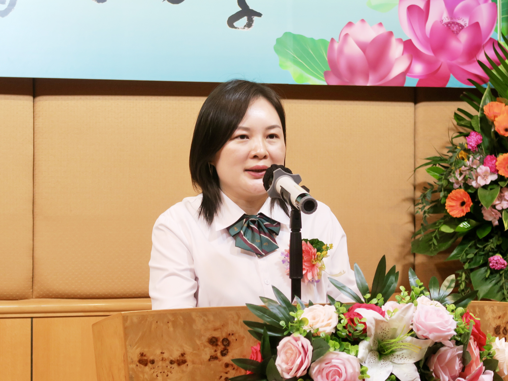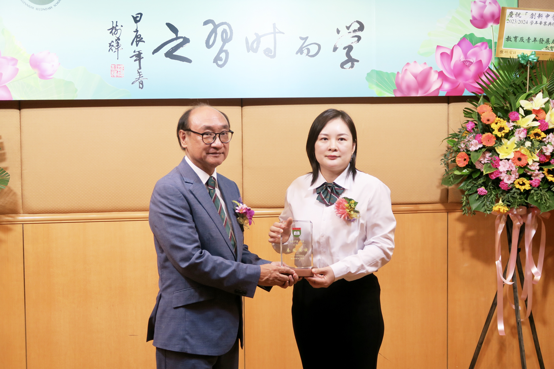 學生張玉鳳代表畢業同學致感謝辭,稱將牢記母校教導,把所學知識融會貫通,攀上更高的台階。她並向校方致送紀念品,以感謝學校及老師的悉心教導及栽培。