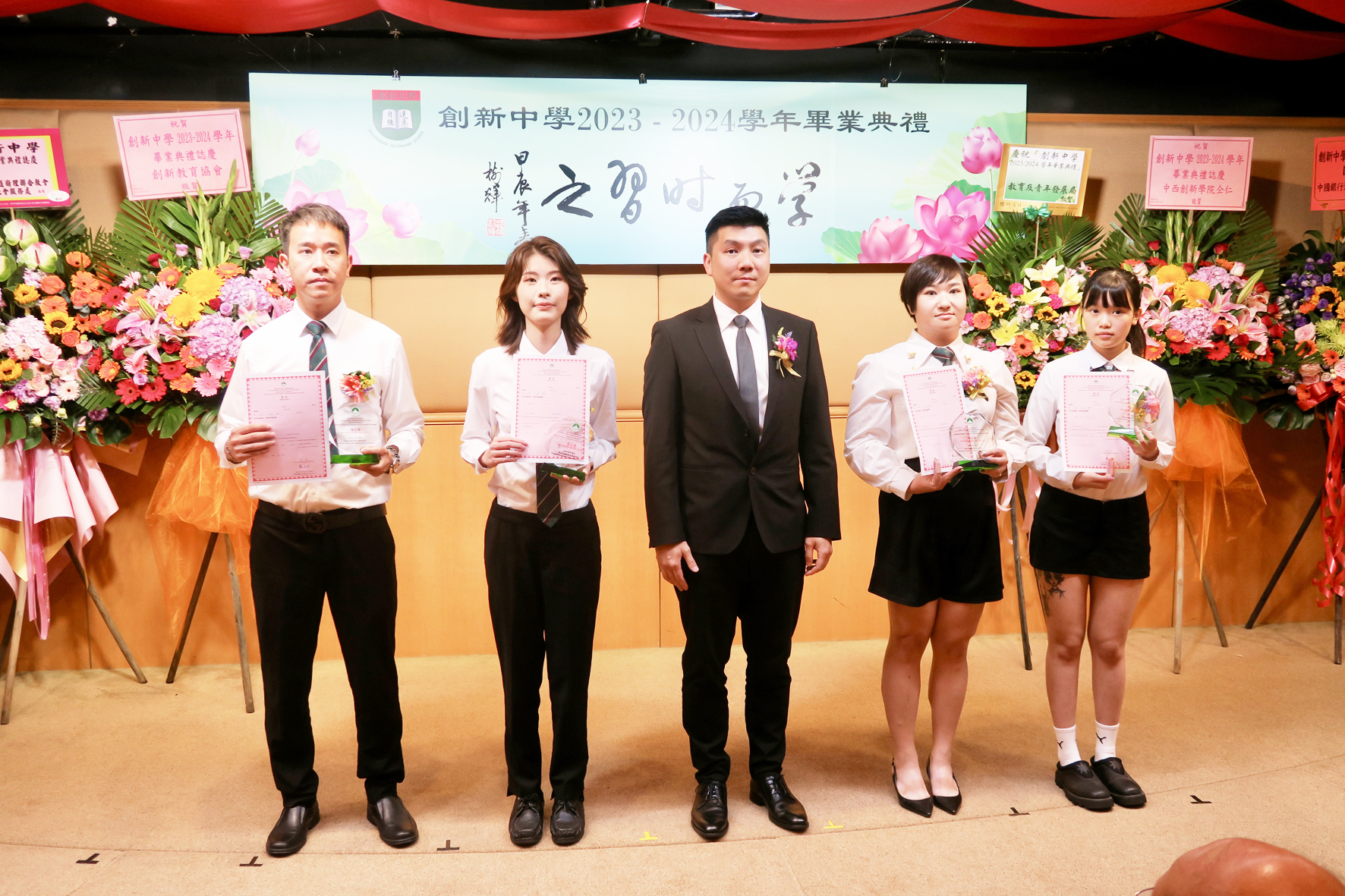 畢業典禮昨晚7時半舉行,教青局代處長陳澤賢,創新中學校董會主席蘇樹輝、校長崔寶峰、校董陳偉明、陳亮瑜、孫格芳,澳門循道衛理聯合教會社會服務處主任鄧詠琪,中國工商銀行(澳門)股份有限公司(置地總行)行長邱潔,中國銀行澳門分行(新馬路支行)中心行行長王金思,創新中學同學會理事長歐漢龍等嘉賓出席。